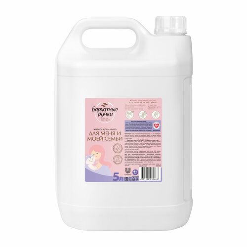 Жидкое Крем-мыло для рук Бархатные ручки Для меня и моей семьи 5 л. Крем-мыло нежно и глубоко очищает кожу, а отсутствие выраженного запаха и красителей обеспечивает комфортное использование для каждого члена семьи. Поэтому мыло способствует уходу за кожей рук уже во время мытья и подготавливает кожу к восприятию полезных компонентов крема.