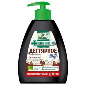 Мыло жидкое Весна Главаптека Дегтярное глубоко очищает, подсушивает, обладает ранозаживляющим действием, помогает избавится от угрей, черных точек, воспалений. Деготь способствует быстрой регенерации кожи, а дегтярным мылом можно не только умываться, но и делать из пены мыла делать маску на несколько минут это естественный пилинг, который, к тому же, выравнивает цвет кожи. Жидкое мыло густое, но текучее и лёгкое, не вязкое, ощущения смолистости на руке не даёт. Жидкое мыло не содержит искусственных красителей и парфюмерных добавок. Дегтярным мылом можно мыть волосы и кожу головы помогает от перхоти.