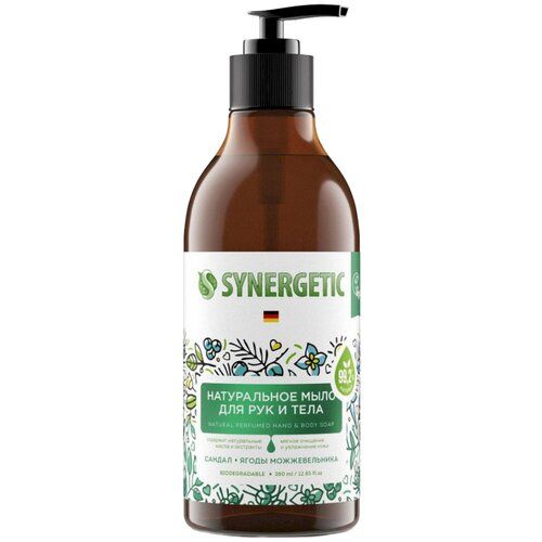 Натуральное биоразлагаемое мыло для рук и тела SYNERGETIC "Сандал и ягоды можжевельника" - это деликатное средство для очищения кожи, более чем на 99% состоящее из натуральных компонентов. Гипоаллергенный аромат мыла разработан в швейцарском доме Givaudan с использованием натуральных эфирных масел пачули, ладанника, герани, гурьюнского бальзама и розового перца. Масла макадамии и гранатовых косточек восстанавливают, питают и увлажняют кожу, делая её гладкой и бархатистой. Экстракты сандалового дерева и можжевельника увлажняют кожу и оказывают тонизирующий эффект. Софоролипид из рапсового масла мягко очищает и сохраняет естественный микробиом кожи. Состав: Aqua; Biobased Sodium Laureth Sulfate; Sodium Lauroamphoacetate; Lauryl Lactate; Candida Bombicola/Glucose/Methyl Rapeseedate Ferment; Coco Glucoside; Glyceryl Oleate; Parfum; Macadamia Seed Oil Polyglyceryl-4 Esters; Punica Granatum Seed Oil Polyglyceryl-4 Esters; Hydroxypropyl Guar Hydroxypropyltrimonium Chloride; Saccharide Isomerate; Tetrasodium Glutamate Diacetate; Glycerin; Santalum Album (Sandalwood) Wood Extract; Juniperus Communis Fruit/Leaf Water; Sodium Citrate; Sodium Chloride; Sodium Benzoate; Potassium Sorbate.
