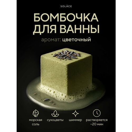 Кубическая бомбочка ручной работы с ароматом цветочный. При соприкосновении с водой она начинает шипеть, растворяя в себе морскую соль, сухоцветы и шиммер. Аромат раскрывается мягко, наполняя воздух атмосферой расслабления. Шиммер придаёт воде лёгкое сияние, создавая визуальный эффект спокойствия. Бомбочка подойдёт для вечернего ухода, душевного подарка или тихого ритуала после насыщенного дня. Solace не торопит и не требует — он просто создаёт пространство, в котором аромат цветочный становится частью вас. Оттенок: зеленый. Один кубик — одна встреча с собой.
