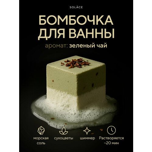 Кубическая бомбочка ручной работы с ароматом зеленый чай. При соприкосновении с водой она начинает шипеть, растворяя в себе морскую соль, сухоцветы и шиммер. Аромат раскрывается мягко, наполняя воздух атмосферой расслабления. Шиммер придаёт воде лёгкое сияние, создавая визуальный эффект спокойствия. Бомбочка подойдёт для вечернего ухода, душевного подарка или тихого ритуала после насыщенного дня. Solace не торопит и не требует — он просто создаёт пространство, в котором аромат зеленый чай становится частью вас. Оттенок: светло-зеленый. Один кубик — одна встреча с собой.