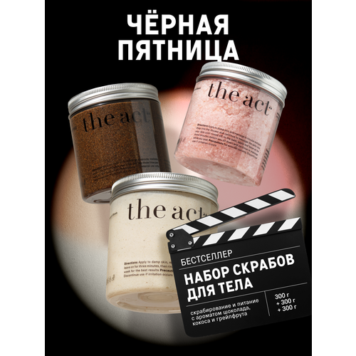 В наборе самые популярные скрабы от The Act: кокосовый скраб, грейпфрутовый и кофейный с ароматом шоколада