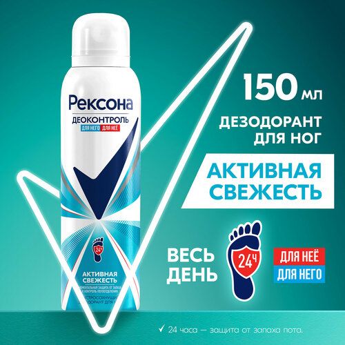 Дезодорант для ног Активная свежесть от Rexona Деоконтроль обеспечивает моментальную защиту от запаха пота до 24 часов даже при интенсивных нагрузках и занятиях спортом. Благодаря уникальному* составу он снижает потоотделение, сохраняя водный баланс кожи, и препятствует размножению бактерий, вызывающих неприятный запах. Он универсален для мужчин и женщин. Подходит для стоп, а также подмышек и ладоней.