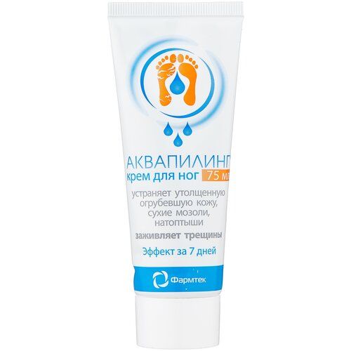 Аквапилинг крем для ног 75мл от огруб кожи и сухих мозолей. Инструкция по применению: Состав Вода очищенная, карбамид, глицерин, масло вазелиновое, масло кукурузное, акриламид/натрий акрилоилдиметилтаурат сополимер, изогексадекан, полисорбат 80, стеариновая кислота, циклопентасилоксан (и) диметиконол, масло лаванды, масло эвкалипта, экстракт зеленого чая, экстракт ромашки, масло мяты, фенохем, молочная кислота. Действие аквапилинг крем содержит мочевину в концентрации 25%. Такая концентрация обладает выраженным кератолитическим действием, благодаря чему устраняется огрубевшая кожа в области стоп, коленей, локтей, мозоли и натоптыши. Видимый эффект наступает уже через 7 дней регулярного применения крема. Мочевина является естественным метаболитом организма и абсолютно безопасна. Аквапилинг крем также заживляет трещины на подошвах благодаря содержанию натуральных масел (лаванды, эвкалипта, мяты) и экстрактов растений (зеленого чая и ромашки), которые обеспечивают: - Заживляющий эффект. - Противовоспалительный эффект. - Дезодорирующий эффект. Аквапилинг крем обладает насыщенной, но не жирной текстурой, хорошо впитывается кожей, не содержит отдушек и красителей. Активные компоненты Мочевина, натуральные масла (лаванды, эвкалипта, мяты) и экстракты растений (зеленого чая и ромашки). Назначение - Гиперкератоз (утолщенная, шершавая, огрубевшая кожа) подошв, коленей, локтей. Устранение и профилактика. - Мозоли и натоптыши. Устранение и профилактика. - Заживление трещин на коже стоп. Описание - Эффективно борется с утолщенной, огрубевшей, сухой кожей стоп, ладоней, коленей, локтей. - Эффект за 7 дней применения. - Заживляет трещины на коже стоп. - Оказывает выраженное профилактическое действие. Результат Регулярное применение крема предотвращает образование новых участков огрубевшей сухой кожи и трещин. Кожа становится гладкой и приобретает здоровый вид уже после 7 дней применения крема Специальные указания Эффективно заживляет трещины и увлажняет кожу. Обладает приятной текстурой и дезодорирующим эффектом.