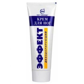 Крем для ног «Эффект» дезодорирующий специально разработан для ухода за кожей стоп и областью между пальцами ног. Активные ингредиенты: оксид цинка, экстракты коры дуба, лимона и чистотела, ментол и специальная небиоцидная добавка для дезодорирующих средств. Крем для ног «Эффект» дезодорирующий обеспечивает комплексный уход: оказывает бактерицидное и антисептическое действия, подсушивает кожу стоп, склонных к потливости, предотвращает запах пота; обеспечивает освежающий эффект, обладает успокаивающим и защитным действиями, оказывает противовоспалительное действие, снижает потливость и освежает. Способ применения: нанести на чистую кожу ног до полного впитывания. Состав: оксид цинка, экстракты коры дуба, лимона и чистотела, ментол и специальная небиоцидная добавка.