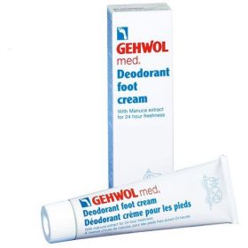 Геволь мед Крем-дезодорант для ног (Gehwol med Deodorant foot cream) содержит в качестве основы масло жожоба, алое вера, комбинацию масла чайного дерева (мануки) и активизированного оксида цинка для устранения сильного запаха ног на длительное время.