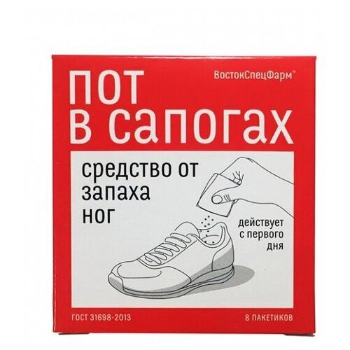 ВостокСпецФарм Пот В Сапогах Средство от запаха ног 8х1.5 г - дезодорант от запаха пота ног и обуви. Особенности: Действует с первого дня, нормализует потоотделение на 6 месяцев. Нейтрализатор запаха пота для обуви Пот в сапогах решает проблему неприятных запахов кроссовок, коньков и роликов и горнолыжных ботинок, для борцовок и повседневной обуви раз и навсегда. Удаляет источник неприятного запаха внутри обуви. Средство для ног от запаха и пота обеспечивает моментальную защиту от запаха пота до 24 часов, снижает потоотделение, сохраняя водный баланс кожи, и препятствует размножению бактерий, вызывающих неприятный запах. В состав входят антибактериальные компоненты, которые помогают нейтрализовать запах за счет подавления развития бактерий, способствующих появлению неприятного запаха. Подходит для женщин и мужчин. Антибактериальный.