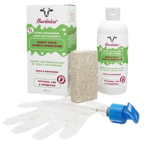 Для удобства в комплекте полный набор для педикюра: лосьон-кератолитик, пемза, 3 пары одноразовых перчаток и дозатор.