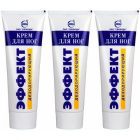 Крем для ног Эффект дезодорирующий специально разработан для ухода за кожей стоп и областью между пальцами ног. Активные ингредиенты: оксид цинка, экстракты коры дуба, лимона и чистотела, ментол и специальная небиоцидная добавка для дезодорирующих средств. Крем обеспечивает комплексный уход: оказывает бактерицидное и антисептическое действия, подсушивает кожу стоп, склонных к потливости; предотвращает запах пота; обеспечивает освежающий эффект, обладает успокаивающим и защитным действиями; оказывает противовоспалительное действие, снижает потливость и освежает. В комплекте - 3 штуки.