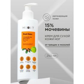 Миксит Восстанавливающий крем с мочевиной, ментолом и кокосом для ухода за очень сухой кожей ног и пяточек Foot Care Cream for dry feet 6-in-1. Уходовое средство борется против трещин, натоптышей и мозолей на пятках. Обеспечивает увлажнение и питание кожи стоп, восстановление и снятие усталости, смягчение сухих пяток.