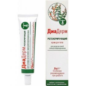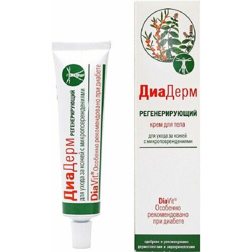 DiaVit Крем для кожи тела Диадерм Регенерирующий 46 мл. Ускоряет восстановление кожи в местах её микроповреждений: инъекции инсулина, прокол кожи на кончиках пальцев для забора крови на анализ, трещинки, ссадинки, царапины. Специальная основа крема «запечатывает» ранку, препятствуя проникновению инфекции, активные компоненты способствуют остановке капиллярного кровотечения и регенерации кожи. Кровоостанавливающий комплекс - масло шалфея и экстракт бадана обладает выраженным противовоспалительным, вяжущим действием, способствует остановке капиллярного кровотечения. Пленкообразующий комплекс - лиственничная смола и вощина запечатывает ранку и предохраняет ее от загрязнений. Антибактериальный комплекс - шалфей мускатный и экстракт бадана предохраняет ранку от присоединения бактериальной инфекции. Регенерирующий комплекс - масло облепихи, аллантоин, комплекс витаминов А, Е и С эффективно улучшает процессы восстановления кожи. Обезболивающий компонент - масло мяты быстро устраняет неприятные болевые ощущения в местах повреждений.
