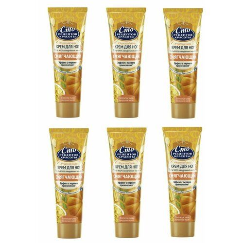 Сто рецептов красоты Крем для ног "Смягчающий" отлично смягчает и восстанавливает сухую кожу стоп, помогает предотвратить возникновение шелушения и сухости, делая ноги гладкими и ухоженными. Оказывает регенерирующее и витаминизирующее действие. Крем быстро впитывается, не оставляя жирной пленки и следов на одежде и обуви. В рецепте: Масло золотистой тыквы -отлично смягчает, удерживает влагу в коже. Кукурузное масло - смягчает и питает кожу, обладает антиоксидантным действием, способствует восстановлению защитных функций кожи. В комплекте 6 штук