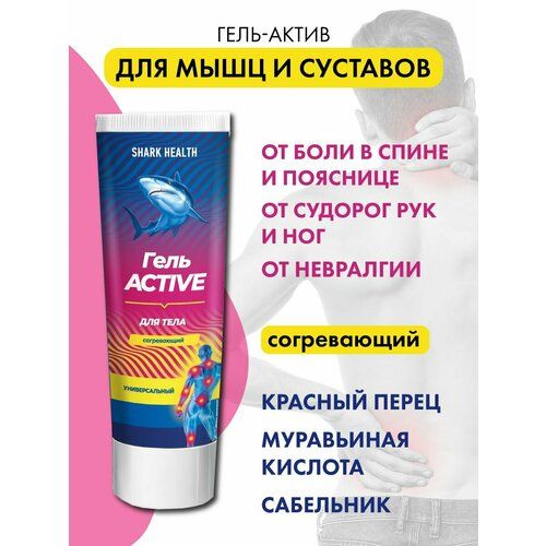 Крем Shark Health от судорог от онемения от невралгии. Чудо мазь от мышечных спазмов, защемления нервов, судорог, онемения, прострелов в шею и поясницу. За счет входящих в состав красного перца, муравьиной кислоты эфирных масел и камфары, гель оказывает согревающий эффект, успешно справляется с мышечным болями, невралгией, судорогами, онемением, спазмами и растяжением связок. Хондроитин из акульих хрящей и сабельник активизируют процесс регенерации околосуставных тканей и выработку собственного коллагена, придают прочность и эластичность суставным и мышечным тканям, нормализуют их работу. Гель-актив рекомендуется применять для разогрева и снятия боли и напряжения в области мышц, в том числе при больших физических нагрузках и занятиях спортом. Разогревающая мазь Shark Health достойно заменит или дополнит другие препараты для мышц, связок и суставов. Можно использовать как крем для тела, крем для рук, крем для ног. Способ применения: наносить на проблемный участок 2-3 раза в день. Внимание: крем содержит натуральные компоненты с местно-раздражающим действием, которые могут вызвать покраснение, покалывание и чувство жжения. Этот эффект обеспечивает приток крови к месту нанесения, усиливает действие крема и обеспечивает лечебный и обезболивающий эффект. В зависимости от степени чувствительности кожи, данный эффект может отсутствовать или держаться до получаса.