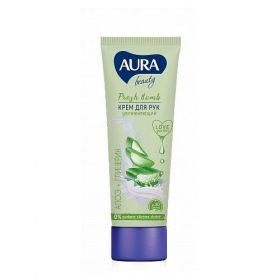 Увлажняющий крем для рук AURA BEAUTY обладает легкой кремовой текстурой и свежим «зеленым» ароматом. Комплекс активных добавок: экстракт алоэ вера, глицерин и масло ши, быстро устранят неприятное чувство стянутости и сухости, позаботится о сохранении водного баланса и активизирует защитные свойства кожи. Нежные и ухоженные ручки за 60 секунд Специальный комплекс из 3-х активных компонентов, интенсивно увлажняет и защищает кожу рук. Без спирта, парабенов и силиконов