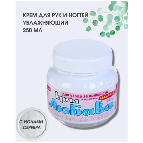 Крем Любава 250 мл с ионами серебра. Легкий питательный увлажняющий крем для рук и тела «Любава MAXFORTE» представляет собой mix ухаживающих и восстанавливающих компонентов – надёжную защиту от ветра, мороза, ультрафиолета и других неблагоприятных факторов. Экспресс помощь ручкам, заменяет крема для рук зимние. Крем универсальный и подходит для всех типов кожи, можно использовать как ночной крем перед сном, можно как дневной крем. Сезон зима-лето. Комплекс из пяти растительных масел и лекарственных экстрактов буквально холит и лелеет кожу наших ручек. Сухая, тусклая, она моментально преображается, становится гладкой и бархатистой, приятной на ощупь. Восстанавливающий крем для рук устраняет неприятные шелушения и дискомфорт. Натуральные растительные масла, входящие в крем для очень сухой кожи рук, насыщены витаминами молодости - A, E, F и D, которые отлично тонизируют кожу, дарят ей свежесть и сияние. Полезные жирные кислоты, микро- и макроэлементы в составе масел способствуют правильному функционированию клеток. Оливковое масло устраняет сухость и шелушение, обезвоживание кожи, способствует активной регенерации тканей. Подсолнечное масло благодаря высокому содержанию витамина Е усиливает кислородное питание клеток эпидермиса, восстанавливает его здоровый вид, замедляет процессы возрастной пигментации. Кокосовое масло интенсивно питает, увлажняет и разглаживает, усиливая естественную защиту кожи. Масло виноградной косточки и масло ши (или карите) нормализуют обменные процессы, обладают антиоксидантными и лёгкими отбеливающими свойствами. Дополняет состав кремовой эмульсии травяной лекарственный коктейль. Экстракт ромашки успокаивает, мягко отбеливает кожу рук, оказывает антисептическое действие. Вытяжка конского каштана устраняет воспаления и отёчность. Биологически активные вещества экстракта свёклы и календулы заживляют мелкие трещинки, убирают раздражение, придают коже здоровый вид. О её прочности и эластичности заботится коллаген, входящий в состав крема. Крем питательный для рук благоприятно воздействует на сухую кожу локтей, смягчает огрубевшую подошву ног, пятки и другие проблемные участки тела. Консистенция позволяет крему хорошо распределяться и впитываться, оставляя ощущение нежной заботы. Способ применения: небольшое количество крема для рук нанести на чистую, сухую кожу легкими массирующими движениями до полного впитывания. Также можно применять крем для сухих локтей.