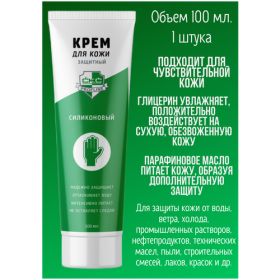 — Средство индивидуальной защиты дерматологическое, защитное; — Крем предназначен для защиты кожи рук от вредных воздействий внешних факторов и окружающей среды – воды, ветра, холода, бытовых и промышленных растворов, нефтепродуктов, технических масел, пыли, строительных смесей, красок, лаков, смазочных материалов и др; — Легко наносится на кожу, быстро впитывается; — Крем для защиты кожи покрывает руки защитной плёнкой, предотвращает ощущение стянутости кожи и быстрое испарение влаги; — Крем предназначен для защиты кожи рук при работе с техническими маслами, нефтепродуктами, смазочными, веществами, щелочью и кислотами, графитом, угольной и металлической пылью, лаками, эффективен при воздействии ветра, холода. Крем рекомендован для людей, которые часто контактируют с химическими веществами и при этом не используют перчатки; — Создает на руках защитную силиконовую «перчатку»; — Современные силиконы обеспечивают бережный уход и полноценную защиту; — Глицерин хорошо увлажняет, положительно воздействует на сухую, обезвоженную кожу; — Силиконовая основа позволяет бережно наносить крем даже на очень сухую и раздраженную кожу, создает надежный защитный барьер; — Парафиновое масло питает кожу и позволяет силиконам «сцепиться» с кожей, образует дополнительную защиту, отлично питает и смягчает кожу; — Изготовитель: ООО "Динаком", Россия, Московская область, г. Жуковский