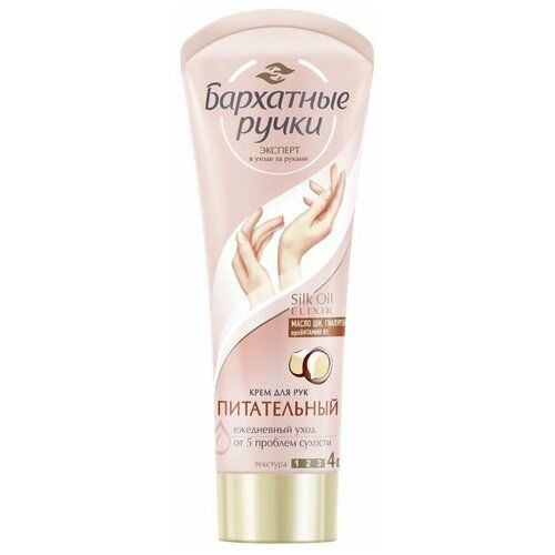 Бренд Бархатные Ручки представляет крем для рук питательный. Насыщенный крем с гиалуроном устраняет 5 проблем сухости кожи и делает ее заметно мягче и нежнее. Интенсивно разглаживая кожу, придает рукам ухоженный вид. Формула Silk Oil Elixir усилена гиалуроном для глубокого питания кожи после контакта с водой. Кожа ваших рук нежная для ласковых прикосновений и бесценных моментов. Микромасла восстанавливают клетки кожи и в комплексе с протеинами шелка делают ее мягкой и нежной. Использование дневного и ночного крема повышает эффективность ухода в 2 раза Ваша кожа гладкая и шелковистая