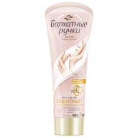 Бренд Бархатные Ручки представляет крем для рук Защитный, разработанный для экстразащиты кожи рук при воздействии агрессивных факторов среды[1]. Крем имеет текстуру средней плотности для повышенной защиты. В составе крема - новейшая формула Silk Oil Elixir с микро-маслами и протеинами шелка, благодаря чему кожа Ваших рук обретет удивительную нежность, гладкость и красоту на целый день.