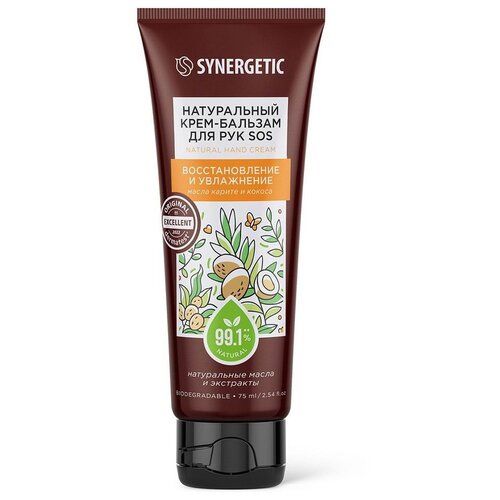 Крем бальзам для рук Synergetic SOS восстановление и увлажнение 75 мл. Натуральный крем-бальзам для рук Synergetic SOS восстановление и увлажнение комплексно регенерирует и интенсивно питает кожу рук, моментально возвращая ей невероятную мягкость и эластичность. Нежная текстура и активная формула способствуют экспресс уходу и восстановлению. Натуральный пребиотик и природный антиоксидант трегалоза нормализует и сохраняет естественный микробиом кожи. Бисаболол успокаивает и помогает восстановить барьерные функции кожи, снимает раздражения и покраснения, повышает упругость, способствует более глубокому проникновению активных веществ в глубокие слои кожи. Масла карите, кокоса и оливы помогают сохранять баланс влаги, насыщают кожу полезными микроэлементами, глубоко и длительно увлажняют, придают эластичность и шелковистую гладкость, защищают от воздействия факторов внешней среды. Экстракт бергамота сужает поры, устраняет воспаление и раздражение, отлично тонизирует и освежает, улучшая состояние и выравнивая цвет кожи. Продукт дерматологически протестирован на чувствительной коже независимым институтом в Германии. Крем не содержит парабенов, минеральных масел, силиконов и красителей, не тестируется на животных и сертифицирован британской организацией The Vegan Society. Знак Vegan - мировой стандарт этичной продукции. Способ применения: нанести на чистую сухую кожу. Меры предосторожности: при попадании в глаза, промыть водой. Только для наружного применения. Хранить отдельно от еды. Состав: Aqua, Glycerinx, Butyrospermum Parkii Butterx (масло карите), Caprylic / Capric Triglyceridex, Potassium Cetyl Phosphatex, Behenyl Alcoholx, Isoamyl Lauratex, Stearic Acidx, Palmitic Acidx, Cetearyl Alcoholx, Glyceryl Stearatex, Betainex, Cetyl Estersx, Coco-Caprylate / Capratex, Cocos Nucifera Oilx (масло кокоса), Citrus Aurantium Bergamia Fruit Extractx (экстракт бергамота), Olive Oil Polyglyceryl-4 Estersx (масло оливы), Saccharide Isomeratex, Trehalosex, Sodium PCAx, Bisabololx, Sorbitan Caprylatex, Propanediolx, Xanthan Gumx, Parfum, Benzoic Acidx, Sodium Benzoatex, Potassium Sorbatex, Citric Acidx, Sodium Citratex, Potassium Hydroxidex.