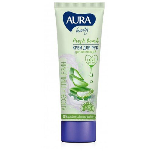 Увлажняющий крем для рук Aura Beauty с глицерином и экстрактом алоэ вера (75 мл). Экстракт алоэ благодаря своему успокаивающему эффекту восстанавливает поврежденные клетки кожи, возвращая ей молодость и гладкость. Глицерин выравнивает структуру кожи, преп.