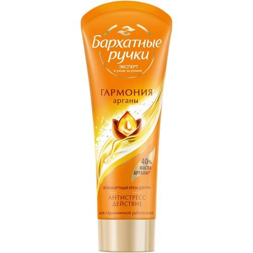 Бренд Бархатные Ручки представляет крем для рук Гармония арганы, который содержит 40% масла арганы*. Насыщенная текстура крема питает и смягчает кожу, а входящие в него антиоксиданты восстанавливают и способствуют сохранению молодости. Масло арганы, получаемое из ядрышек косточковых плодов дерева, произрастающего в Марокко, одно из самых редких и ценных масел в мире. Масло обогащено витамином Е, жирными кислотами и природными антиоксидантами. Прекрасно впитывается, придает коже мягкость, защищает от сухости и раздражения. Разглаживает неглубокие морщины, стимулирует кровообращение. глицерин оказывает смягчающее действие на кожу, увлажняет ее. Небольшие по размеру молекулы глицерина способны преодолевать липидный барьер кожи и проникать в глубокие слои эпидермиса. Исследования показали, что глицерин способствует нормальному процессу жизнедеятельности клеток эпидермиса. мочевина - увлажняющий компонент, подходит для сухой, чувствительной кожи. Входит в состав натурального увлажняющего фактора NMF (ряд низкомолекулярных веществ кожи)аллантоин - бесцветное кристаллическое вещество натурального происхождения. Оказывает смягчающее и увлажняющее действие, стимулирует обновление клеток эпидермиса. масло виноградной косточки нормализует систему самозащиты клеток от свободных радикалов, восстанавливает способноссть клетки к регенерации, препятствует их старению. Масло разглаживает сухую кожу, увлажняет и питает ее, устранчяет шелушение и раздражение. результат: невероятно нежная и мягкая кожа рук *в масляном комплексе, отмеченном в составеУказанные свойства, в том числе результат, подтверждены потребительским тестированием, 150 женщин, min 80% согласившихся, РФ, 2016.