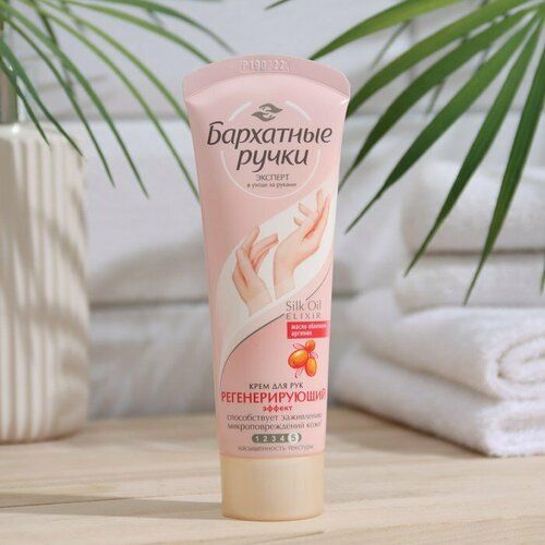 Бренд Бархатные Ручки представляет крем для рук Регенерирующий. Крем разработан специально для кожи рук, требующей особо интенсивного ухода. Компоненты в составе крема активируют восстановление клеток, обеспечивая профилактику появления мелких трещинок. Формула Silk Oil Elixir усиливает действие крема. Микромасла восстанавливают клетки кожи и в комплексе с протеинами шелка делают ее мягкой и нежной. Кожа рук ежедневно испытывает колоссальное воздействие разрушающих стресс-факторов. Регулярное применение крема для рук, не менее 2-х раз в день, восполняет ресурсы кожи, защищая ее от микроповреждений. Формула Silk Oil Elexir представляет собой комплекс, состоящий из микромасел и протеинов шелка. Благодаря своему размеру (до 10 мкм), эти частицы масел способны проникать внутрь эпидермиса, не нарушая липидный барьер, и доставлять питательные вещества клеточкам кожи. Масло облепихи укрепляет стенки кровеносных сосудов и делает их менее проницаемыми, улучшает тканевой обмен веществ, обладает антиоксидантным действием. Аргинин - это аминокислота, способствующая клеточному делению. Служит строительным материалом для производства белков. Аргинин необходим для синтеза креатина. Глицерин оказывает смягчающее действие на кожу, увлажняет ее. Небольшие по размеру молекулы глицерина способны преодолевать липидный барьер кожи и проникать в глубокие слои эпидермиса. Исследования показали, что глицерин способствует нормальному процессу жизнедеятельности клеток эпидермиса. Мочевина - увлажняющий компонент, подходит для сухой, чувствительной кожи. Входит в состав натурального увлажняющего фактора NMF (ряд низкомолекулярных веществ кожи)