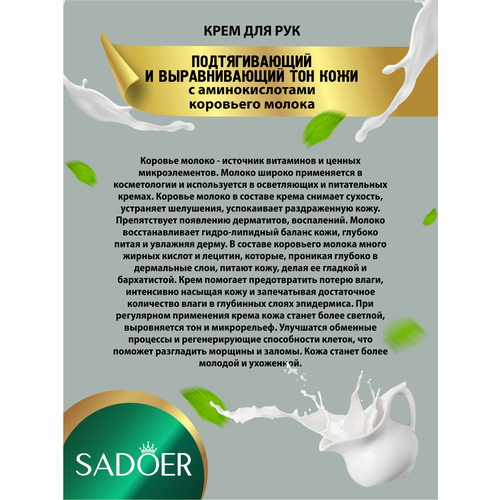 Подтягивающий и выравнивающий крем для рук Sadoer с аминокислотами молока 30 гр. х 2 шт. Коровье молоко - источник витаминов и ценных микроэлементов. Молоко широко применяется в косметологии и используется в осветляющих и питательных кремах. Коровье молоко в составе крема снимает сухость, устраняет шелушения, успокаивает раздраженную кожу. Препятствует появлению дерматитов, воспалений. Молоко восстанавливает гидро-липидный баланс кожи, глубоко питая и увлажняя кожу. В составе коровьего молока много жирных кислот и лецитин, которые, проникая глубоко в дермальные слои, питают кожу, делая ее гладкой и бархатистой. Крем помогает предотвратить потерю влаги, интенсивно насыщая кожу и запечатывая достаточное количество влаги в глубинных слоях эпидермиса. При регулярном применения крема кожа станет более светлой, выровняется тон и микрорельеф. Улучшатся обменные процессы и регенерирующие способности клеток, что поможет разгладить морщины и заломы. Кожа станет более молодой и ухоженной. Способ применения: 1. Помойте руки. 2. Нанесите немного крема и равномерно распределите, втирайте массажными движениями до полного впитывания.