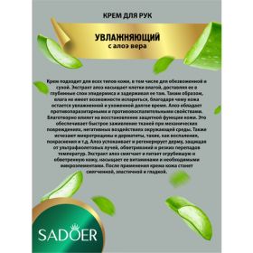 Увлажняющий крем для рук Sadoer с экстрактом алоэ вера 30 гр. х 2 шт. Крем подходит для всех типов кожи, в том числе для обезвоженной и сухой. Экстракт алоэ насыщает клетки влагой, доставляя ее в глубинные слои эпидермиса и задерживая ее там. Таким образом, влага не имеет возможности испариться, благодаря чему кожа остается увлажненной и ухоженной долгое время. Алоэ обладает противопаразитарными и противовоспалительными свойствами. Благотворно влияет на восстановление защитной функции кожи. Это обеспечивает быстрое заживление тканей при механических повреждениях, негативных воздействиях окружающей среды. Также исчезают микротрещины и дерматиты, такие, как воспаления, покраснения и т. д. Алоэ успокаивает и регенерирует кожу, защищая от ультрафиолетовых лучей, обветриваний и резких перепадов температур. Экстракт алоэ смягчает и питает огрубевшую и обветренную кожу, насыщает ее витаминами и необходимыми микроэлементами. После применения крема кожа станет смягченной, эластичной и гладкой. Способ применения: 1. Помойте руки. 2. Нанесите немного крема и равномерно распределите, втирайте массажными движениями до полного впитывания.