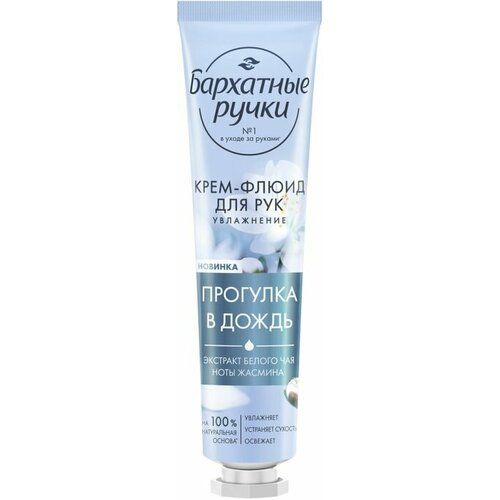 Для ухода за сухой кожей рук попробуйте увлажняющий крем флюид Увлажнение Прогулка в дождь, разработанный экспертом №1 в уходе за руками – брендом Бархатные ручки °. 100% натуральная основа парфюмированного мини-крема для рук содержит экстракт белого чая и миндальное масло, которые совместно с активными ингредиентами эффективно увлажняют, избавляют от сухости и шелушения, освежают. Увлажняющий крем для рук идеален для теплого времени года, когда ваши ручки нуждаются в уходе с легкой текстурой, которая отлично впитывается и освежает кожу. Для наилучшего результата используйте крем утром, после каждого контакта с водой, а также на ночь. Он будет действовать как увлажняющий, питательный и восстанавливающий уход за руками. Продукт представлен в формате мини (объем 30 мл), маленький тюбик удобно положить с собой в сумочку и использовать по мере необходимости на работе или в течение дня. Уходовые средства из серии Увлажнение – настоящее спасение для сухой и очень сухой кожи рук. Легкая текстура флюида отлично распределяется по коже и быстро впитывается. Нежный акватический аромат стартует с фруктовых нот, далее следуют зеленые нотки и аккорд жасмина, в завершении – мускусные и древесные ноты. Оцените всю серию парфюмированных кремов Бархатные ручки и выберите идеальный для себя. Моменты нежности, Сладкие мечты, Нежная вуаль, Прогулка в дождь – уходовая косметика для рук отличается эффективным комплексным подходом. Нежные ароматы, роскошные текстуры и актуальный дизайн упаковки доставят особое удовольствие во время использования.