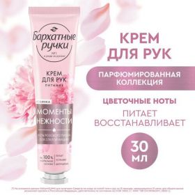 Добавьте в свой уход новинку от эксперта №1 в уходе за руками – бренда Бархатные ручки ° – парфюмированный крем для рук Питание Моменты нежности. Питательный крем на 100% натуральной основе отлично подойдет для сухой и очень сухой кожи. Текстура крема эффективно питает, устраняет стянутость, защищает от сухости и шелушения, при этом отлично распределяется по коже и быстро впитывается.