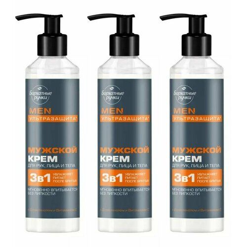 Встречайте долгожданную новинку, разработанную экспертами бренда Бархатные ручки специально для мужчин, – крем для рук, лица и тела 3 в 1 Идеальное решение, когда нужен качественный мультифункциональный крем. Продукт содержит Д-пантенол и витамин С, мгновенно впитывается без липкости и жирности, увлажняет и устраняет сухость. Может быть использован как крем после бритья, как крем для тела и рук. В комплекте 3 шт.