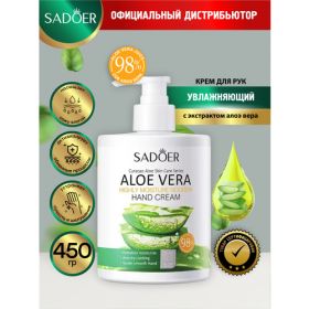 Увлажняющий крем для рук Sadoer с экстрактом алоэ вера 450 гр. Крем эффективно успокаивает и восстанавливает чувствительную и раздраженную кожу рук, устраняет сухость и шелушения, выравнивает ее тон. Экстракт алоэ вера насыщает клетки влагой, устраняет воспаления и раздражения, оказывает антивозрастное, антиоксидантное и тонизирующее действие, активизирует кровообращение и обменные процессы, ускоряет выработку коллагена и разглаживает микрорельеф кожи. Крем подходит для всех типов кожи, в том числе для обезвоженной и сухой.