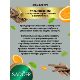 Увлажняющий крем для рук Sadoer с экстрактом корня солодки и витамином С 30 гр. х 5 шт. Крем для рук с витамином C и экстрактом корня солодки создан для глубокого увлажнения, питания и защиты кожи рук. Витамин C, как мощный антиоксидант, способствует ускорению процессов регенерации клеток кожи, стимулирует выработку коллагена и усиливает защитные функции кожи, помогая ей противостоять вредным воздействиям окружающей среды. Экстракт корня солодки, известный своими противовоспалительными и успокаивающими свойствами, дополнительно смягчает и питает кожу, защищая ее от раздражений и аллергических реакций. Он помогает поддерживать оптимальный уровень увлажненности, предотвращая сухость и шелушение. Крем оказывает омолаживающее действие, придавая коже рук упругость и сияние.