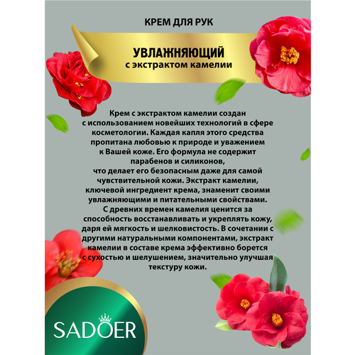 Увлажняющий крем для рук Sadoer с экстрактом камелии 40 гр. х 10 шт. Крем с экстрактом камелии создан с использованием новейших технологий в сфере косметологии. Каждая капля этого средства пропитана любовью к природе и уважением к Вашей коже. Его формула не содержит парабенов и силиконов, что делает его безопасным даже для самой чувствительной кожи. Экстракт камелии, ключевой ингредиент крема, знаменит своими увлажняющими и питательными свойствами. С древних времен камелия ценится за способность восстанавливать и укреплять кожу, даря ей мягкость и шелковистость. В сочетании с другими натуральными компонентами, экстракт камелии в составe крема эффективно борется с сухостью и шелушением, значительно улучшая текстуру кожи.
