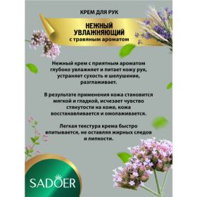 Нежный увлажняющий мягкий крем для рук Sadoer с травяным ароматом 40 гр. х 10 шт. Крем для рук Sadoer с травяным ароматом - это нежное и увлажняющее средство, которое предназначено для ухода за кожей рук. В составе экстракты растений и другие натуральные ингредиенты, способствующие восстановлению и защите кожи. Крем глубоко проникает в кожу, обеспечивая её увлажнение и смягчение. Легкая и приятная консистенция крема быстро впитывается, не оставляя жирной пленки. Натуральный аромат трав создает ощущение свежести и натуральности, придавая дополнительное удовольствие от использования.