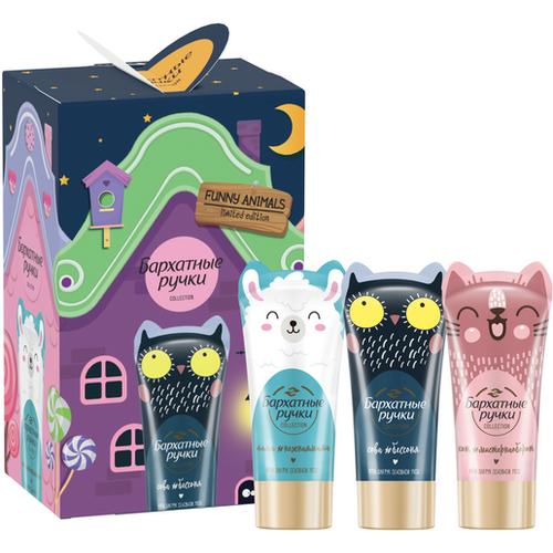Подарите заботу о красоте и нежности рук с подарочным набором от бренда Бархатные ручки. Коллекция мини-кремов для рук Основной уход представлена в милом ушастом формате: лама, совушка и кот. В наборе три крема, а это значит, что любимый продукт всегда под рукой: дома, на работе, в машине. Крем обладает легкой текстурой, не оставляет липкой пленки и надолго увлажняет кожу рук. Нежный аромат подарит особое удовольствие во время использования. Состав крема специально подобран экспертами бренда Бархатные Ручки для увлажнения, питания и восстановления кожи. Алоэ вера известно своим увлажняющим и тонизирующим действием. Кокосовое масло помогает коже противостоять воздействию свободных радикалов, способствует сохранению упругости и эластичности кожи. Витамин B3 восстанавливает влагоудерживающую способность кожи. Аллантоин оказывает смягчающее и увлажняющее действие, стимулирует обновление клеток эпидермиса. Кукурузное масло обладает смягчающим и питательным действием. За один контакт с жесткой водой, состояние кожи рук ухудшается на 30 %. А за один контакт с моющими средствами ухудшается в 2 раза. Эксперты бренда Бархатные Ручки рекомендуют наносить крем сразу после контакта с водой (приборка, мытье посуды, мытье рук), чтобы избежать 5 проблем сухости кожи с помощью регулярного применения крема. Подходит детям с 4 лет. Одобрено дерматологами. Насладитесь мягкой, нежной и ухоженной кожей рук. Свойства подтверждены клиническими исследованиями, РФ, 2015.