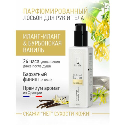 Парфюмированный лосьон для рук и тела Иланг-иланг и Бурбонская ваниль от IQ BEAUTY - премиум парфюм - уход с активными ингредиентами в формуле, который глубоко увлажняет и питает кожу 24 часа, оставляя роскошный аромат иланг-иланга и бурбонской ванили.