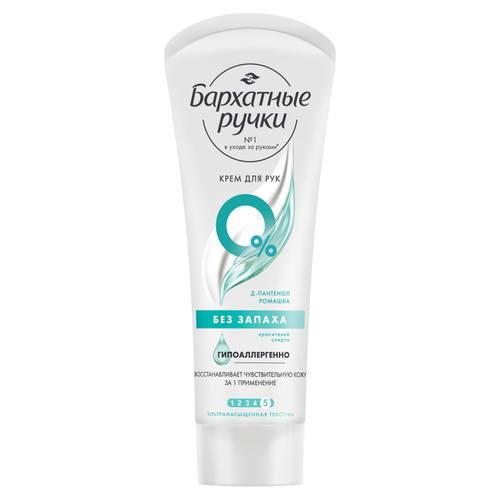 Бренд Бархатные Ручки представляет крем для рук без запаха.Сухая и чувствительная кожа рук требует специального и бережного ухода. Интенсивный крем с формулой Silk Oil Elixir, усиленной пантенолом и ромашкой, разработан специально для быстрого восстановления сухой и чувствительной кожи рук.Отдушки могут являться катализатором аллергии. Многие потребители не могут использовать крема с ярко-выраженным запахом из-за аллергической реакции. Крем Бархатные ручки не содержит отдушки и является гипоаллергенным, подходит для использования в сезон аллергии. Продукт рекомендован дерматологами и аллергологами.Крем обладает густой и ультра насыщенной текстурой, но при этом быстро впитывается без липкости и жирности. Текстура крема без запаха самая насыщенная и концентрированная в основной линейке бренда Бархатные ручки.Крем для рук Бархатные ручки полностью подходит для использования для нее и для него. Универсальная формула крема полностью подходит как для женской, так и для мужской кожи рук.Формула продукта содержит 100% полезные компоненты, без красителей, парабенов, спирта, что снижает вероятность возникновения неприятных ощущений и возникновения аллергической реакции. Крем укрепляет собственный защитный барьер чувствительной кожи для предотвращения воздействия внешних агрессивных факторов.Формула продукта содержит Д-Пантенол и Ромашку:Д-пантенол восстанавливает и увлажняет сухую, чувствительную кожу рук;Ромашка успокаивает сухую и чувствительную кожу рук. Снимает признаки раздражения и шелушения кожи.Способ применения: наносите на чистую сухую кожу, легко массируя.Состав: Aqua, Cetearyl Alcohol, C12-15 Alkyl Benzoate, Glycerin, Glyceryl Stearate Citrate, Potassium Cetyl Phosphate, Prunus Amygdalus Dulcis (Sweet Almond) Oil, Urea, Chamomilla Recutita (Matricaria) Flower/Leaf Extract (экстракт ромашки), Hydrolyzed Silk Extract, Inulin, Panthenol (пантенол), Allantoin, Caprylyl Glycol, Dipropylene Glycol, Disodium EDTA, Glyceryl Caprylate, Glycine Soja (Soybean) Oil, Hydroxyacetophenone, Niacinamide, Pantolactone.
