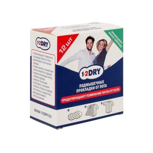 Прокладки д/подмышек от пота 1-2DRY №12 ср.бел.цв.. Инструкция по применению: Состав Многослойные: 100 % хлопковое покрытие, воздушная впитывающая прослойка, дышащий слой, клейкие полоски, защитная бумага. Описание Защищают Вашу одежду, предотвращают появление пятен от пота. Тонкие, мягкие, незаметные, легко крепятся к одежде. Каждая пара в индивидуальной упаковке. Показания Предназначены для мужчин и женщин, предотвращают появление пятен пота на одежде. Подходят для потливости среднего и выше среднего уровня. Способ применения Снимите защитную бумагу с клейкой поверхности. Приложите клейкой стороной к ткани, совместите линию сгиба и шов рукава. Прижмите для надежной склейки с тканью. - Наклеивать на внутреннюю сторону одежды до одевания. - Использовать 1 раз. - Снимать прокладки перед стиркой одежды.