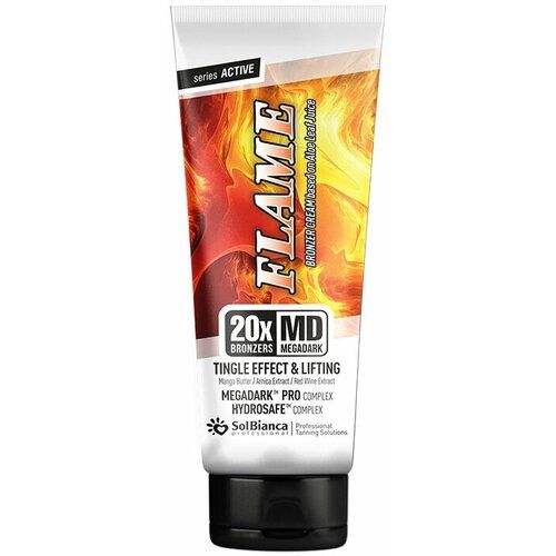 Профессиональный крем для загара в солярии SolBianca FLAME с Tingle (разогревающим) эффектом создан для настоящих ценителей и позволяет быстрее достичь экстремально темных оттенков загара, одновременно бережно ухаживает за кожей, хорошо увлажняет и смягчает. В основе крема сок алоэ вера и легендарный дуэт. Современный профессиональный автобронзер, комплекс-синергетик MEGADARK PRO, в который наряду с ДГА входит тирозин, редкое масло моринги, а также масло грецкого ореха и экстракт моркови. Комплекс сочетает в себе все 3 необходимых элемента - активаторы, корректоры и пролонгаторы загара, работающие в т. ч. на усиление выработки собственного меланина. Итоговый результат зависит непосредственно от базового оттенка кожи и будет хорошо заметен уже через 3 часа после сеанса. Инновационная система по увлажнению и защите кожи HYDROSAFE на основе успокаивающего пантенола, а также биосахаридного комплекса и модифицированного карбамида обеспечивает интенсивное и глубокое увлажнение кожи, сохраняя естественный водный баланс. Tingle (разогревающий) эффект основан на работе экстракта острейшего перца чили, мощно усиливающего микроциркуляцию крови и ускоряющего обменные процессы, а значит, стимулирующего проявление загара. Экстракты горной арники и красного винограда в креме обладают дополнительным лимфодренажным действием, а тропическое масло манго смягчает кожу, питает ее аминокислотами и микроэлементами, повышает упругость и разглаживает. Крем обладает эксклюзивной невесомой консистенцией и аппетитным пряно-ягодным ароматом с виноградной нотой.