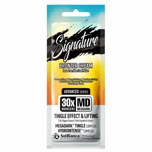 Профессиональный крем-лифтинг для загара в солярии SolBianca SIGNANURE с Tingle (разогревающим) эффектом создан для настоящих ценителей и позволяет быстрее достичь экстремально темных оттенков загара, одновременно бережно ухаживает за кожей, хорошо увлажняет и смягчает. Масло миндаля хорошо смягчает и увлажняет кожу, повышает эластичность и придает ей бархатистость. Экстракт розового грейпфрута помогает формированию коллагеновых волокон для поддержания упругости кожи, имеет антицеллюлитные свойства. 30х автобронзер идеален для второго и последующих этапов загара. Крем не подойдет чувствительной коже. Крем обладает эксклюзивной нежной консистенцией и имеет насыщенный пряный аромат с пудрово-сладкими нотами. Крем не является солнцезащитным средством (не содержит УФ-фильтры), разработан специально для применения в солярии, может использоваться в т.ч. в домашних условиях.