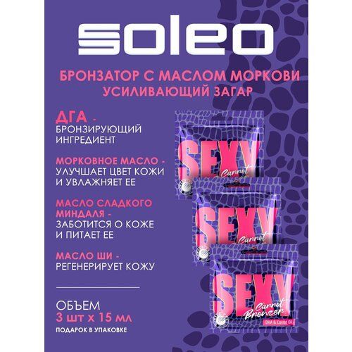 SOLEO WILD TAN CARROT BRONZER DHA – это высокоэффективный крем для загара в солярии, специально разработанный для достижения глубокого и насыщенного золотистого оттенка кожи. В его состав входят натуральные экстракты моркови и инновационная технология DHA, которая обеспечивает ровный загар без пятен и разводов. Крем интенсивно увлажняет и питает кожу, придавая ей здоровый и ухоженный вид. Благодаря уникальной формуле, содержащей мощные антиоксиданты, продукт способствует защиту от свободных радикалов и преждевременного старения. Нежная текстура крема легко наносится и быстро впитывается, не оставляя липких следов. SOLEO WILD TAN CARROT BRONZER DHA идеально подходит для использования в солярии, обеспечивая равномерное и стойкое затемнение кожи, которое сохраняется на длительное время. Подарите себе мгновение роскоши и почувствуйте, как ваша кожа преображается с каждым использованием. Этот бронзатор станет незаменимым атрибутом вашей косметички, помогая вам всегда выглядеть глазами других, будто вы только что вернулись с пляжа. Разрешите себе насладиться качественным загаром с кремом от Soleo и забудьте о неравномерном загаре. Сделайте статью загорать настоящим удовольствием и наслаждайтесь великолепным игристым оттенком вашей кожи.
