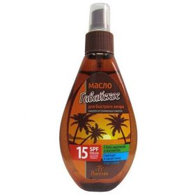 Артикул: 0685-660. Размеры: 6 x 3 x 16 см, Материал: См. на упаковке, Объем: 160 мл, Вес: 160 гр, Размер упаковки: 7 x 15 x 2 см, Возраст: Взрослый, Вид: Масло, Солнцезащитный фактор (SPF): 15. Водостойкое масло обеспечивает быстрый, равномерный и безопасный загар. Комплекс UVA/UVB-фильтров надежно защищает кожу от воздействия ультрафиолетовых лучей. Масло Ши увлажняет и питает кожу, обеспечивая комплексную защиту и предупреждая ее преждевременное старение. Масло легко наносится и быстро впитывается. Предназначено для всех типов кожи. Способ применения: нанести масло на кожу лица и тела за 10-20 минут до принятия солнечных ванн. Состав: Paraffinum Liquidum, Ethylhexyl Methoxycinnamate, Benzophenone-3, Beta-Carotene (бета-каротинн), Prunus Amygdalus Dulcis Oil (масло миндальное), Cocos Nucifera Oil (масло кокосовое), Butyrospermum Parkii Oil (масло Ши), Tocopheryl Acetate (витамин Е), Parfum.
