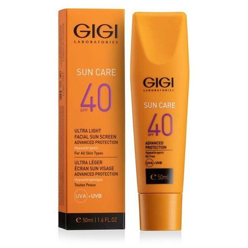 Ультра-легкая гипоалергенная солнцезащитная эмульсия с spf 40 от израильской косметической компании GIGI Cosmetics надежно защищает кожу от солнечных излучений, препятствует появлению сухости и ожогов, увлажняет и питает кожу, насыщает витаминами В5 и Е. Крем водостойкий, легко проникает, не оставляет жирного блеска и белого налета на коже. Крем оказывает легкое омолаживающее действие. Крем подходит для всех типов кожи, в том числе для чувствительной и аллергичной кожи. Он не забивает поры и не раздражает кожу. Не содержит парабенов и минеральных масел.