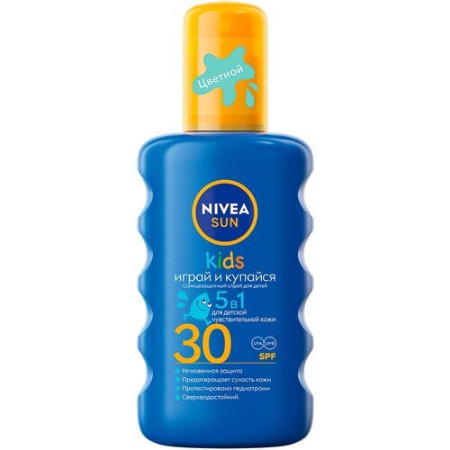Попробуйте детский солнцезащитный ЦВЕТНОЙ (цвет исчезает через несколько секунд после нанесения) спрей Играй и купайся SPF 30 от NIVEA Sun KIDS с высоким фактором защиты, который разработан специально для нежной детской кожи:
