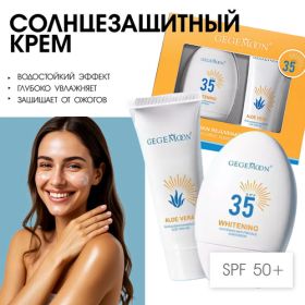 Набор от солнца включает в себя солнцезащитный крем и успокаивающий гель с алоэ вера. Крем GEGEMOON Moisturize Sun Cream SPF35+ обеспечивает надежную защиту от ультрафиолетового излучения и ухаживает за кожей лица, шеи, декольте и тела. Легкий гель на основе алоэ вера освежает, смягчает и увлажняет кожу, быстро впитывается и начинает действовать практически мгновенно. Он создает на поверхности кожи тонкую дышащую пленку, которая содержит влагу, делая ее гладкой и сияющей. Сок алоэ вера находится в помещении, восстановленном из натуральной кожи, снимает раздражение и покраснение. Этот гель идеально подходит для защиты кожи после пребывания на солнце, в условиях соленой или жесткой воды, что делает его предпочтительным выбором в отпуске или после бассейна. Крем подходит для всех типов кожи: жирной, нормальной, комбинированной и сухой. Его легкая текстура легко растягивается и быстро впитывается, не оставляя липкости. Приятный нежный аромат дает свежий исходный продукт с приятным запахом. Питательный крем с SPF 35+ защищает от различных неблагоприятных факторов, включая зимний холод и летнее солнце. Он обладает антивозрастным эффектом и служит отличным под макияжем. Основной активный компонент — гидролизованный коллаген, который соединяет соединительные ткани и поддерживает молекулярную структуру кожи, повышая ее упругость и упругость, а также уменьшая морщины и образуя новые клетки. Защитный крем с коллагеном и пантенолом обеспечивает глубокое увлажнение и осветление. Дневной крем для лица подтягивает кожу, делая ее упругой, мягкой и ухоженной. Он защищен от солнечных лучей, пигментации и последствий преждевременного старения. При регулярном использовании средств наблюдается осветление пигментных пятен и улучшение состояния кожи, а также интенсивная защита от УФ-лучей благодаря использованию рецептурной формулы с комплексными средствами.
