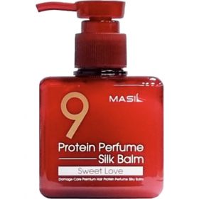 Несмываемый бальзам Masil 9 Protein Perfume Silk Balm Sweet Love увлажняет, питает и разглаживает волосы, восстанавливает повреждения и обеспечивает термозащиту, дарит приятный аромат парфюмерной композиции.