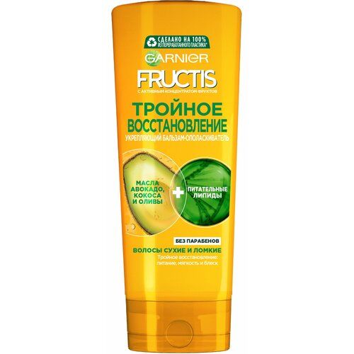 Бальзам для волос Fructis «Тройное восстановление» глубоко восстанавливает и укрепляет волосы от корней до кончиков, придавая им блеск, силу и здоровый внешний вид. 3 масла проникают в каждый слой волоса, восстанавливают, укрепляют его изнутри, возвращают здоровый блеск и облегчают расчёсывание. Масло оливы уменьшает ломкость, укрепляет сердце волоса. Масло авокадо предотвращает сухость, восстанавливает и питает средний слой волоса. Масло карите устраняет тусклость, восстанавливает и разглаживает поверхность волоса.