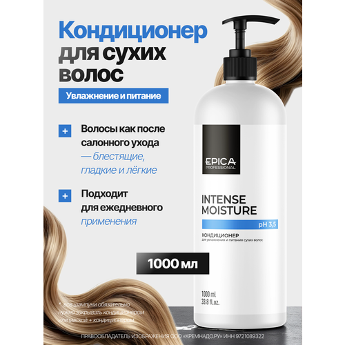 Кондиционер EPICA Professional Intense Moisture с маслами какао и зародышей пшеницы интенсивно смягчает, питает и удерживает влагу в структуре волоса. Он повышает упругость, возвращает естественный блеск и оказывает кондиционирующее действие.