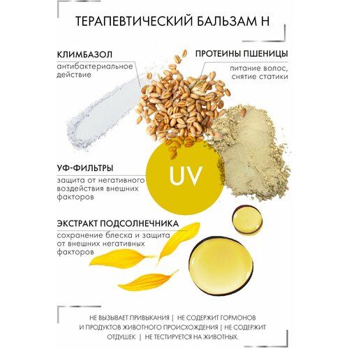 Бальзам-кондиционер для волос питает волосы и улучшает их структуру. Пшеничные и растительные протеины бальзама для волос в насыщает влагой сухие и поврежденные волосы, активно борются с непослушностью и спутыванием волос. Бальзам-кондиционер для волос Н подходит к использованию как женщинам, так мужчинам. Продукт не вызывает привыкания. Не содержит гормонов и продуктов животного происхождения. Не имеет парфюмерных отдушек . Не тестируется на животных. Огромный плюс, что бальзам для волос можно наносить как на длину, так и на кожу головы для устранения чувства стянутости и дискомфорта М. Аликина, тренер System 4.